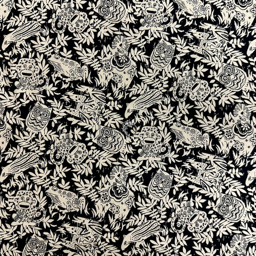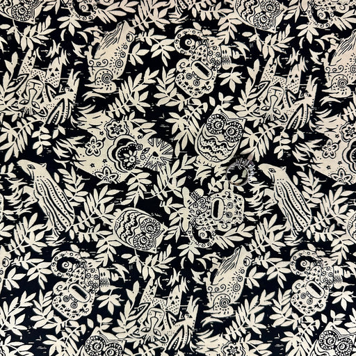 Cotton Fabric BTY Jungle Animal Leaf Folk Art Black Tan Print